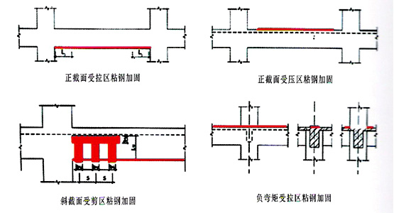 利用專用結(jié)構(gòu)膠將處理后的鋼板粘貼在需要加固的混凝土構(gòu)件表面,使鋼板與混凝土結(jié)構(gòu)形成一個(gè)整體共同受力,粘鋼加固法不僅提高了被加固構(gòu)件的強(qiáng)度,對(duì)構(gòu)件的裂縫展開(kāi)及撓度發(fā)展也有抑制。
