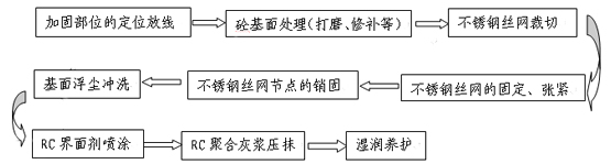 不銹鋼絞線網(wǎng)通過粘合強(qiáng)度及彎曲強(qiáng)度高的滲透性聚合物砂漿附著,與原來的混凝土形成一體。不銹鋼絞線網(wǎng)加上滲透性聚合物砂漿使結(jié)構(gòu)的承載力得到提高,同時(shí)也增加了結(jié)構(gòu)的剛性。滲透性聚合物砂漿使原結(jié)構(gòu)混凝土界面剝離、脫落部位進(jìn)行了修復(fù),使它們重新粘結(jié)成為一個(gè)整體,可以防止結(jié)構(gòu)耐久性的降低,能夠解決新老界面粘結(jié)的問題。